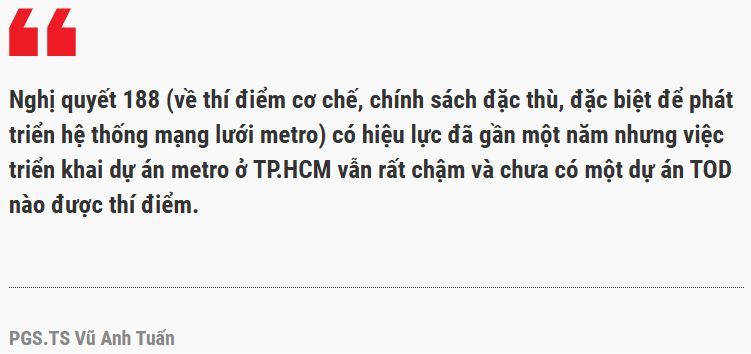 Trong khi TP.HCM hiện nay các sở Quy hoạch – Kiến trúc, Ban Quản lý phát triển đô thị, Sở Xây dựng, Ban Đường sắt đô thị (MAUR), Công ty vận hành metro (HURC1)… đang triển khai mỗi khâu khác nhau. Như thế giá trị gia tăng từ đất đai, hạ tầng, bất động sản, tài chính…khó tạo ra chuỗi tuần hoàn, không tạo ra giá trị nội sinh. Đây là điểm nghẽn thể chế…”, ông Tuấn phân tích.